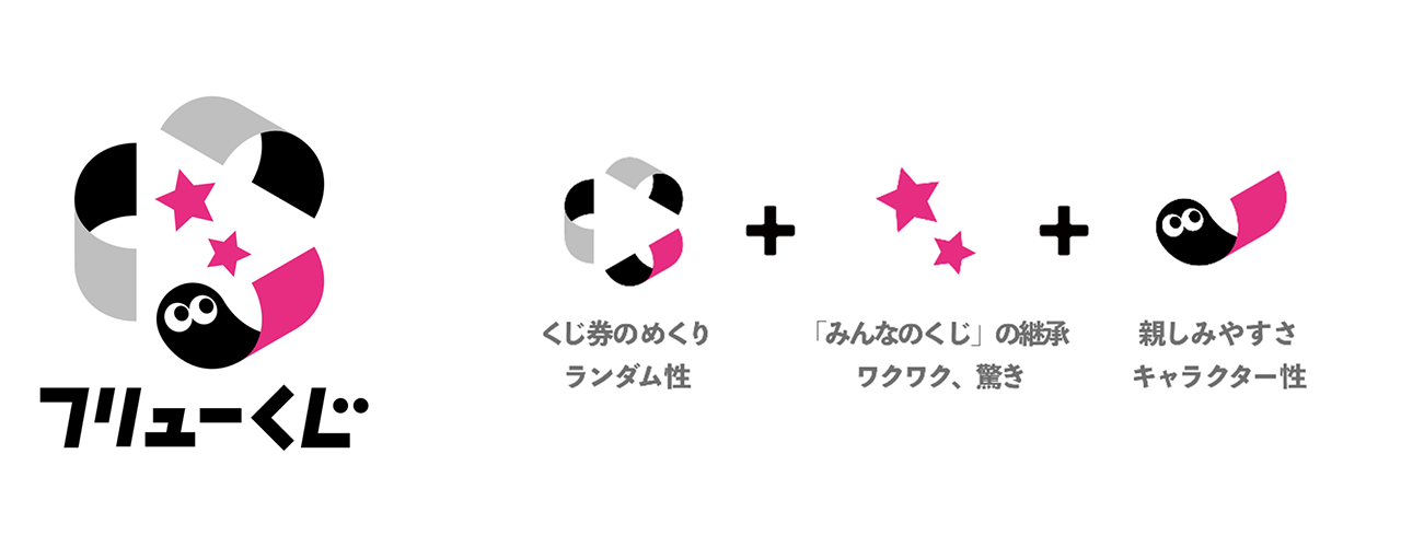 新しいロゴデザインは、くじ券をめくる瞬間の躍動感とくじのランダム性を表現した円形のモチーフをベースに、『みんなのくじ』から継承された星を中央に配置し、くじを引く時の“ワクワク感”を表現。キャラクター性や幅広い世代から好まれるピンク色をアクセントとして取り入れることで、親しみやすさを持ってほしいという想いを込めています。